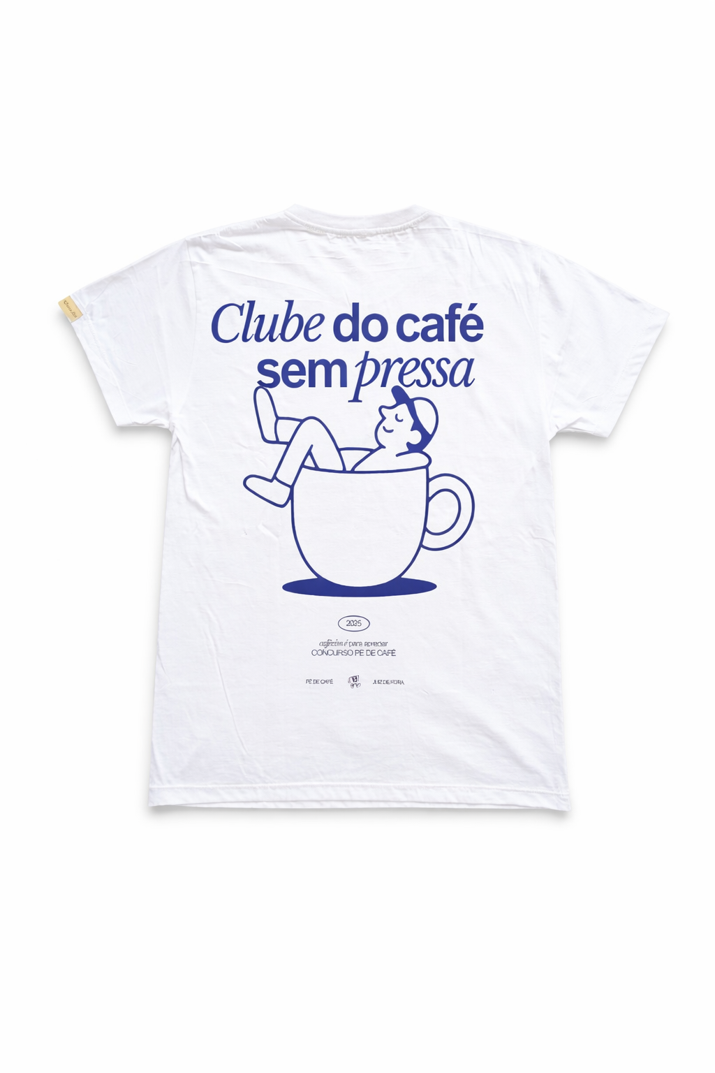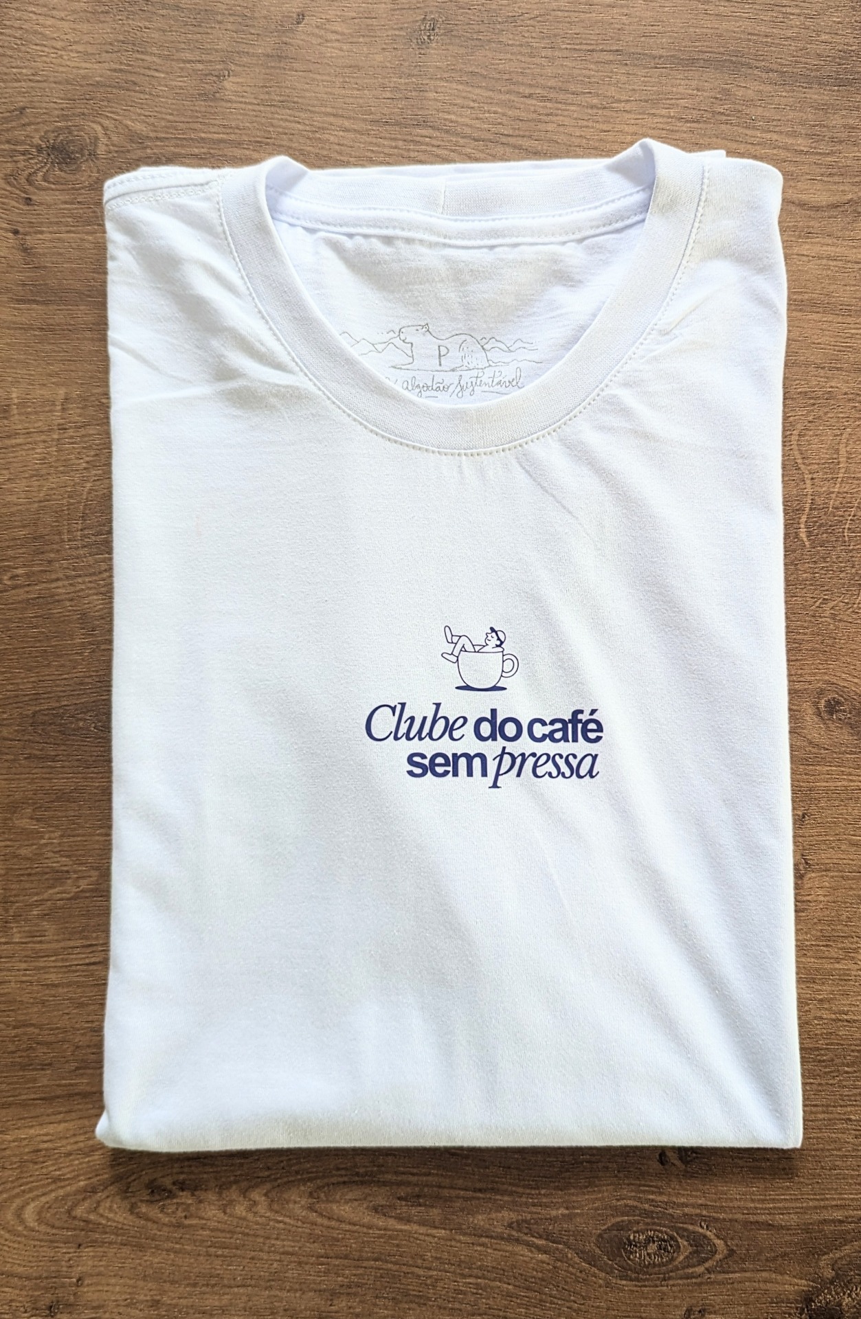 Camiseta branca com estampa e frase: Clube do Café Sem Pressa.